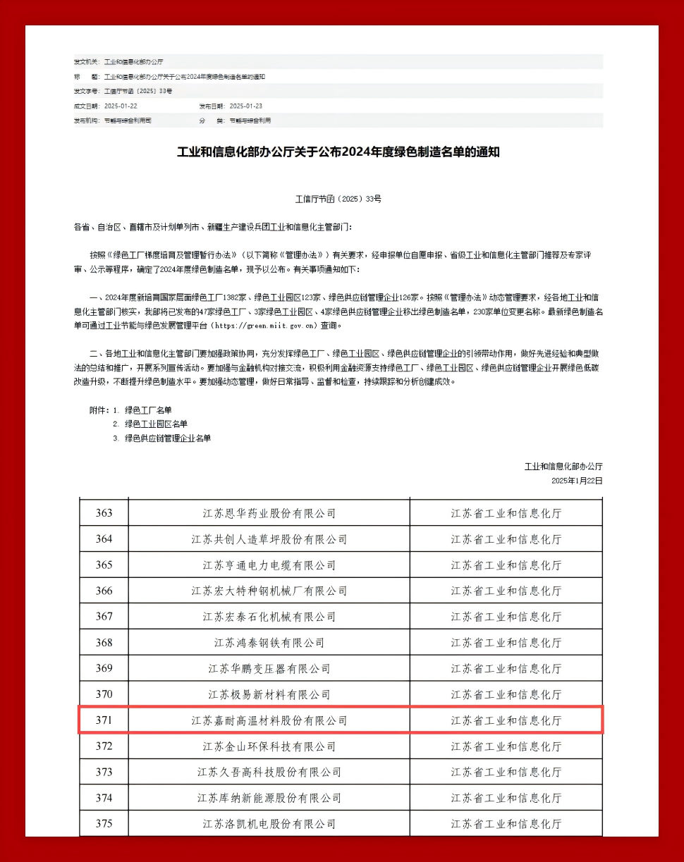 近日,工業(yè)和信息化部 公布2024年度綠色制造名單, 江蘇嘉耐高溫材料股份有限公司 憑借在綠色制造領域的卓越表現(xiàn) 成功榮獲“國家級綠色工廠”榮譽。 嘉耐股份是一家高溫工業(yè)材料的專業(yè)提供商與服務運營商,…